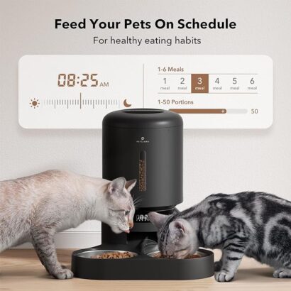 • Feed Two Cats: PETLIBRO automatic cat feeder for two cats comes with an adjustable meal splitter. The unique movable meal splitter ensures food is distributed evenly, and the size of the portions can be adjusted to suit the needs of different cats and dogs. You can be sure your pets won’t have any fights.